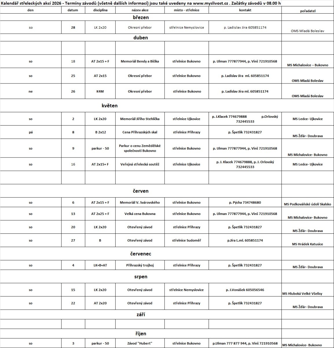 Kalendář střeleckých akcí 2026 - Termíny závodů (včetně dalších informací) budou také uvedeny na www.myslivost.cz.