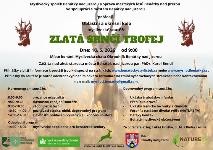 Myslivecký spolek Benátky nad Jizerou a Správa městských lesů Benátky nad Jizerou ve spolupráci s OMS Mladá Boleslav opět po roce vyhlašují oblastní a okresní kolo Zlaté srnčí trofeje, které se uskuteční 16. května 2026 na myslivecké chatě v lese Okrouhlík v Benátkách nad Jizerou.